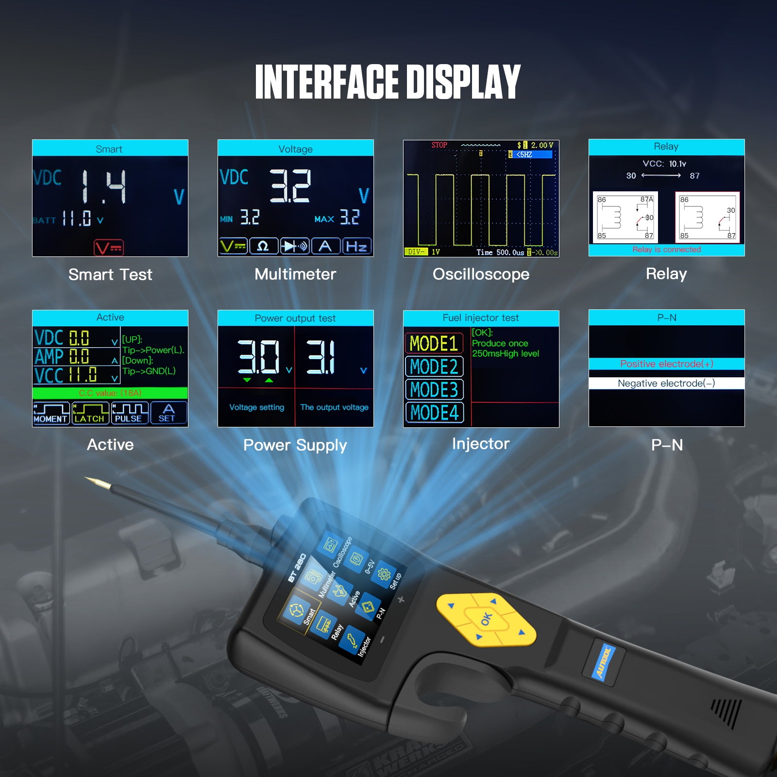 - Comprehensive Testing Capabilities: The BT280 is equipped with a fuel injector tester, power probe, and electric system scanner, allowing you to diagnose a variety of electrical issues in one convenient device.