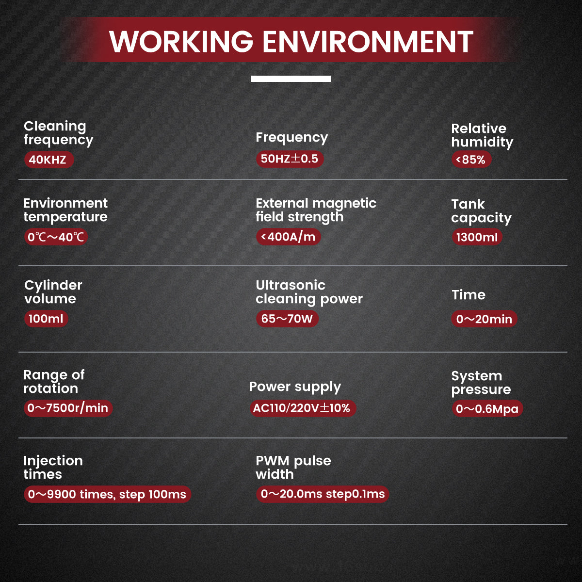 - Ultrasonic Cleaning Technology: Provides deep and effective cleaning, removing dirt and carbon deposits from fuel injectors.